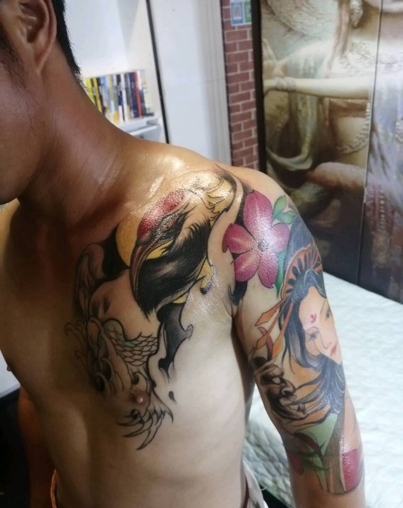 仙鹤艺妓上完色之后纹身图片_胸部手臂新传统纹身图案