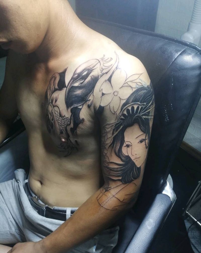 半甲艺妓仙鹤纹身图片_手臂胸部新传统纹身图案