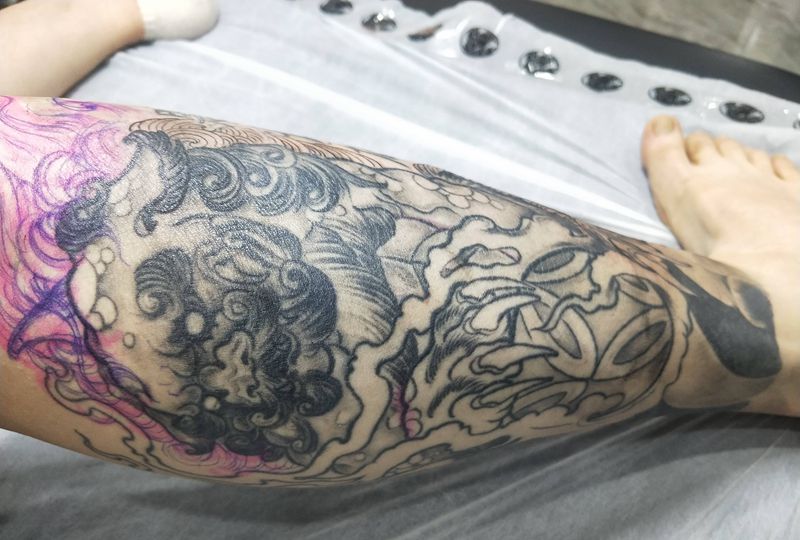 当前位置: 首页 >浙江省嘉兴市纹身店-精雕刺青纹身图案>小腿唐狮花修改纹身图片_腿部新传统唐狮花纹身图案