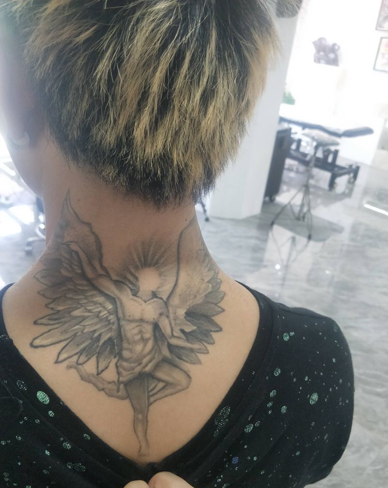 当前位置: 首页 >浙江省嘉兴市纹身店-精雕刺青纹身图案>修改天使纹身图片_颈部欧美写实天使权志龙天使纹身图案