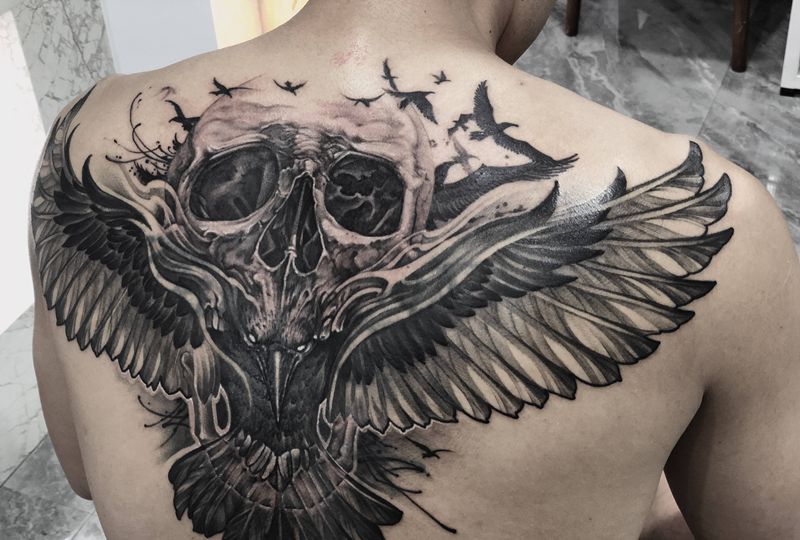 当前位置: 首页 >浙江省嘉兴市纹身店-精雕刺青纹身图案>乌鸦骷髅