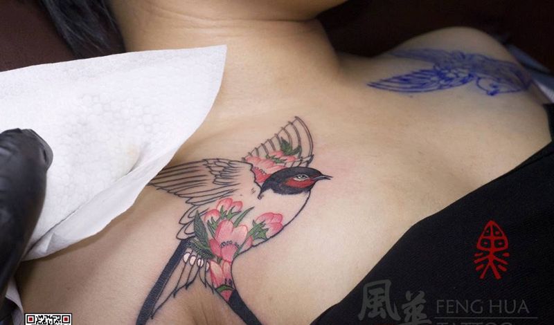 【燕】纹身图片_胸部肩部新传统欧美写实燕子纹身图案