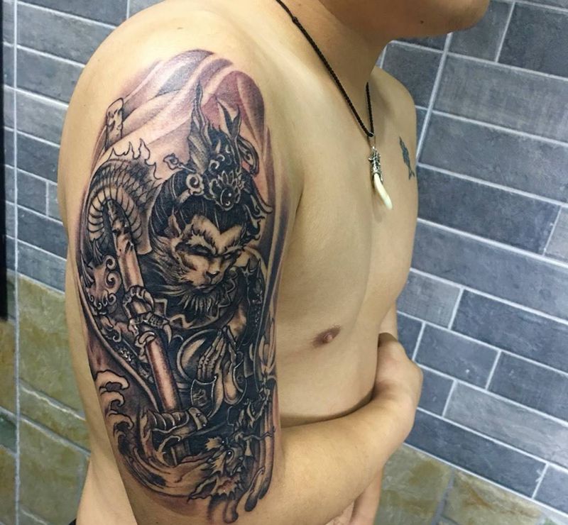 当前位置: 首页 >浙江省绍兴市纹身店-颜刺青·神龙店纹身图案>大圣礼佛纹身图片_手臂传统成品鬼神纹身图案