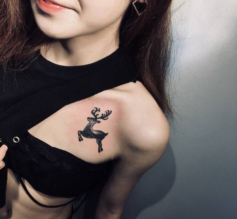 当前位置: 首页 >浙江省绍兴市纹身店-颜刺青·神龙店纹身图案>麋鹿纹身图片_成品胸部清新动物纹身图案