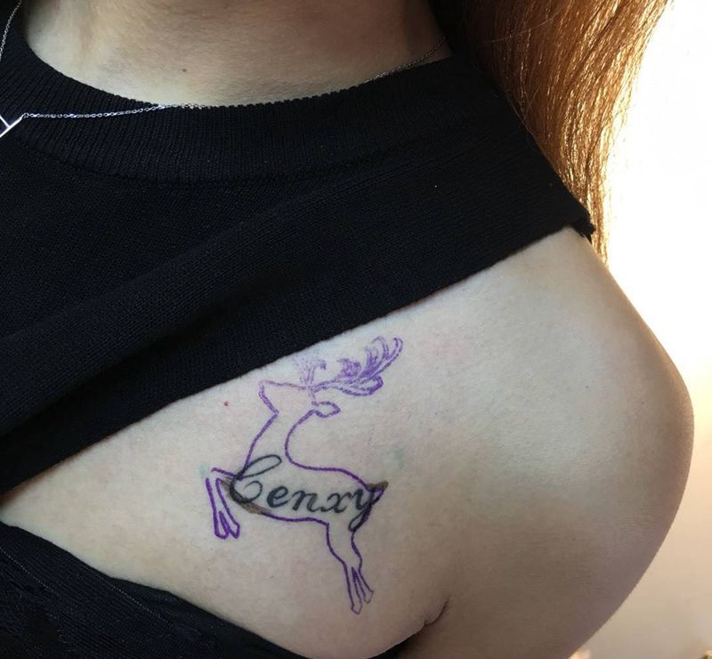当前位置: 首页 >浙江省绍兴市纹身店-颜刺青·神龙店纹身图案>麋鹿纹身图片_成品胸部清新动物纹身图案