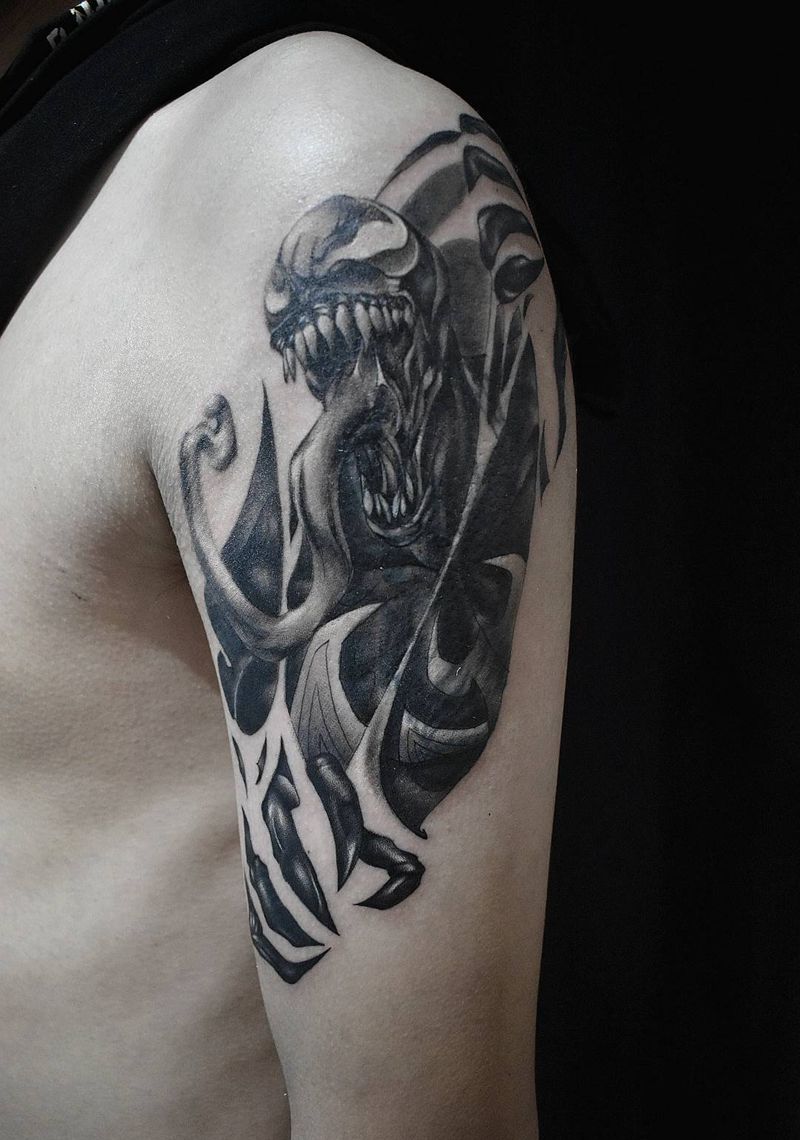 当前位置: 首页 >浙江省湖州市纹身店-硬茧刺青纹身图案>撕裂毒液纹身图片_手臂欧美写实漫威纹身图案