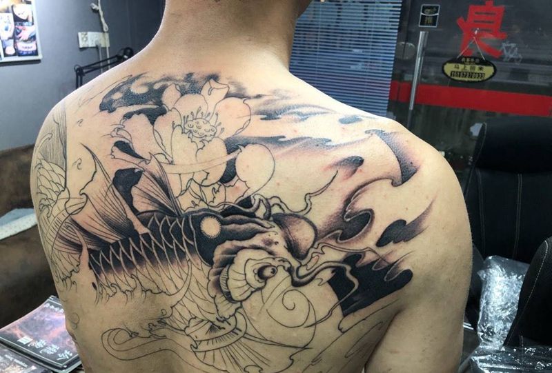 当前位置: 首页 >浙江省嘉兴市纹身店-野风纹身纹身图案>锦鲤 荷花纹身图片_背部新传统纹身图案