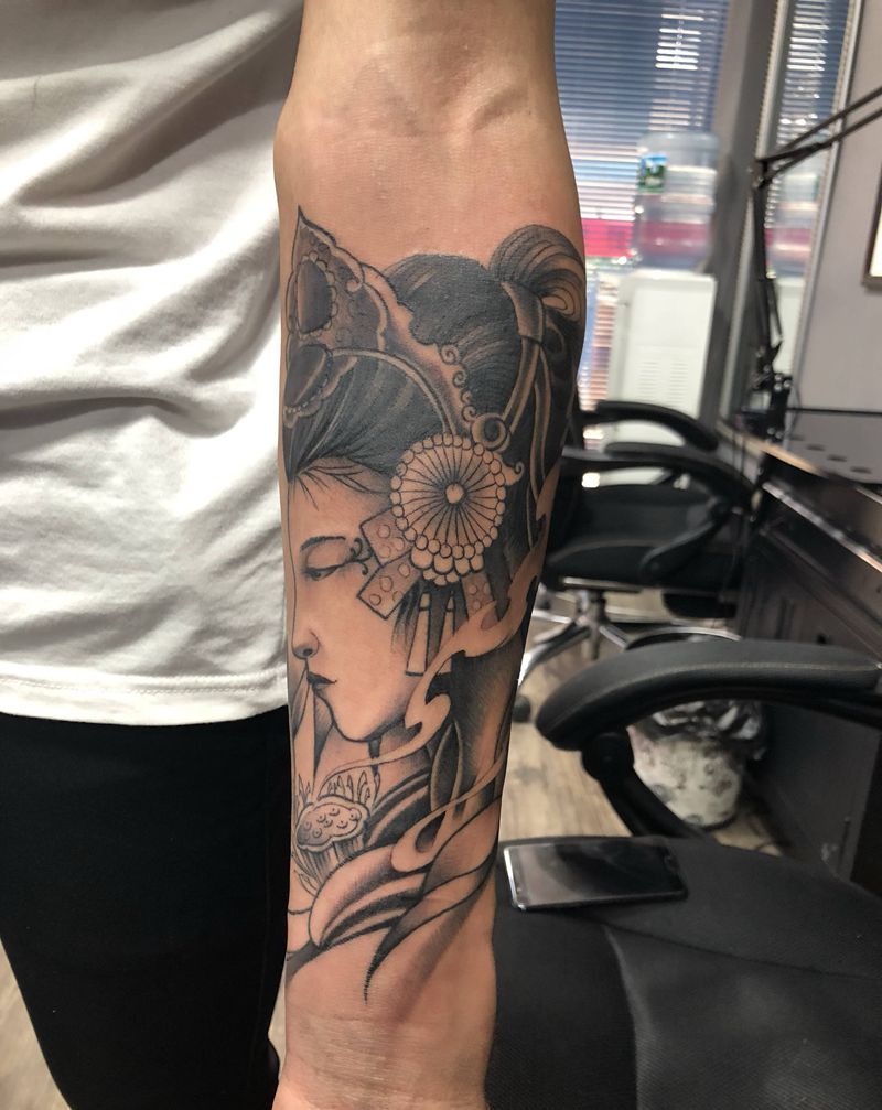 艺妓荷花纹身图片_手臂新传统艺妓 荷花纹身图案