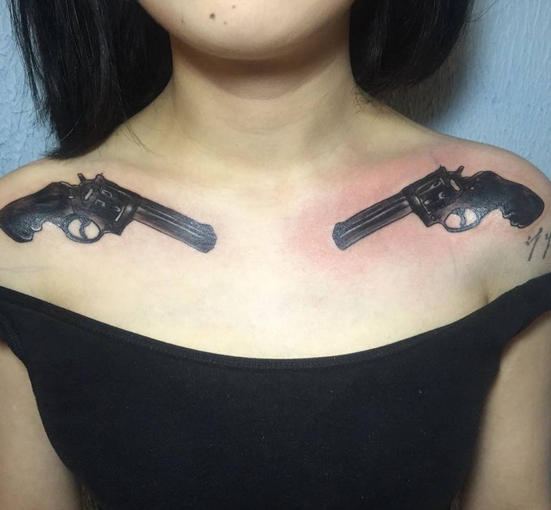 当前位置: 首页 >浙江省嘉兴市纹身店-大潮刺青纹身图案>肩花 手枪纹身图片