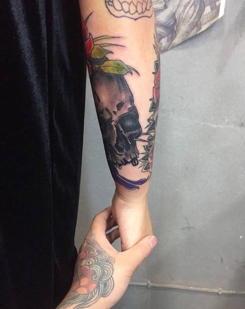当前位置: 首页 >浙江省嘉兴市纹身店-大潮刺青纹身图案>欧美骷髅包小臂纹身图片