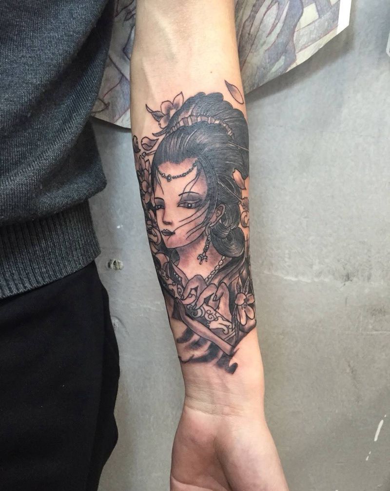 当前位置: 首页 >浙江省嘉兴市纹身店-大潮刺青纹身图案>艺妓小臂内侧黑灰纹身图片