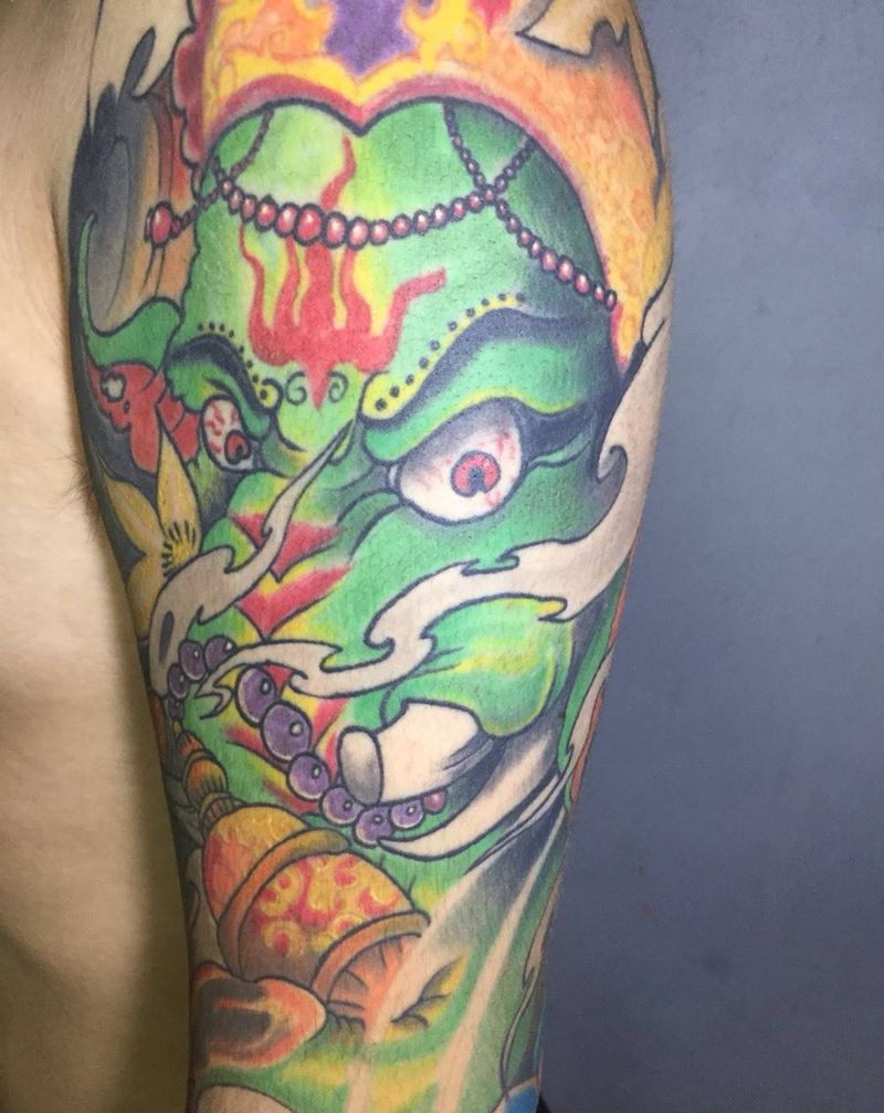 • T网红王老大花腿龙纹身图片_腿部新传统纹身图案