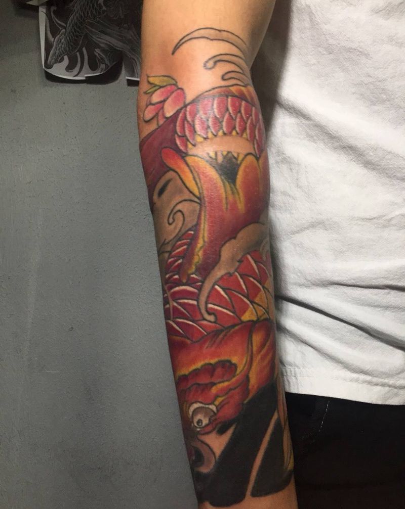 • T网红王老大花腿龙纹身图片_腿部新传统纹身图案