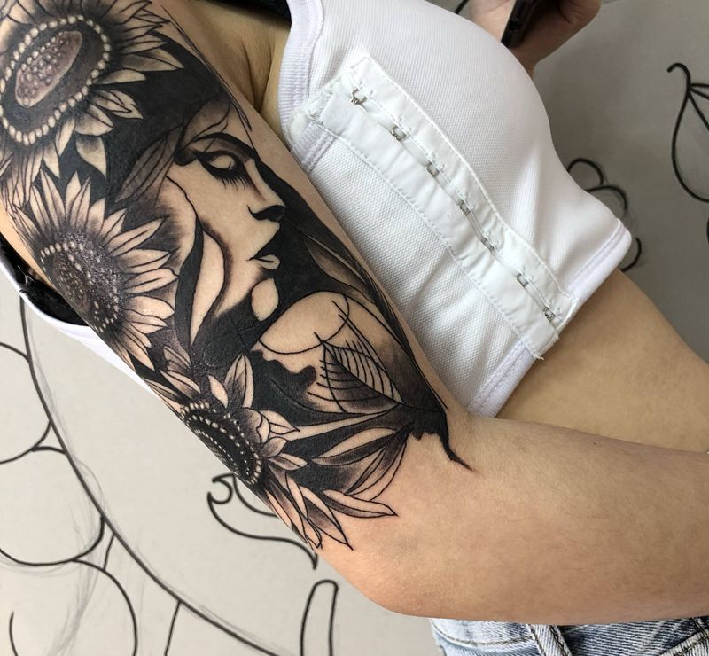 美女 向日葵纹身图片_手臂欧美写实纹身图案