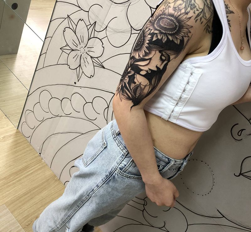 当前位置: 首页 >浙江省嘉兴市纹身店-大潮刺青纹身图案>美女 向日葵纹身图片_手臂欧美写实纹身图案