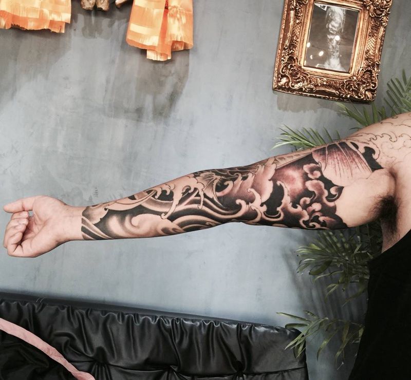 当前位置: 首页 >浙江省湖州市纹身店-皇世刺青纹身图案>花臂鱼。半成品纹身图片