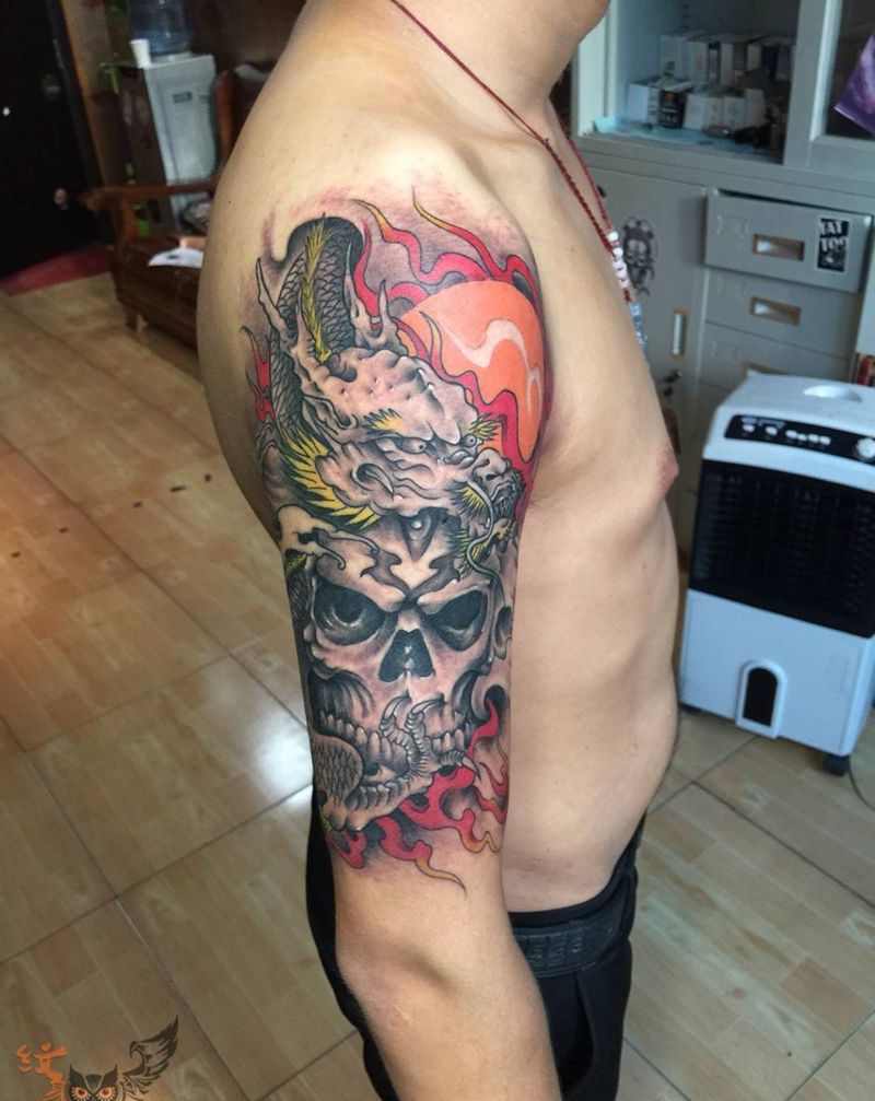 当前位置: 首页 >浙江省湖州市纹身店-皇世刺青纹身图案>大臂龙骷髅头纹身图片