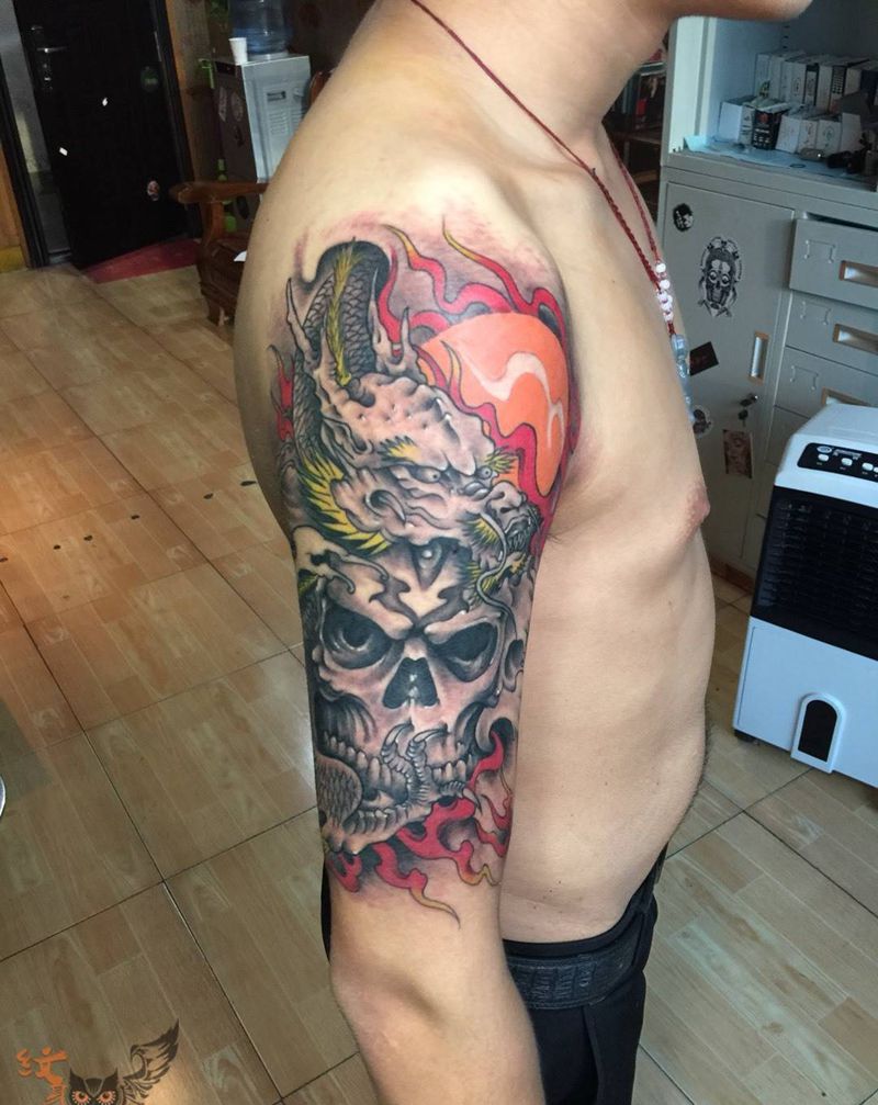 当前位置: 首页 >浙江省湖州市纹身店-皇世刺青纹身图案>大臂龙骷髅头纹身图片