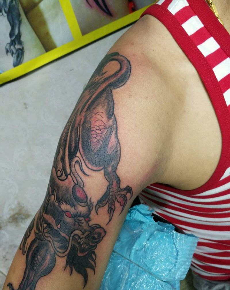 • T网红王老大花腿龙纹身图片_腿部新传统纹身图案