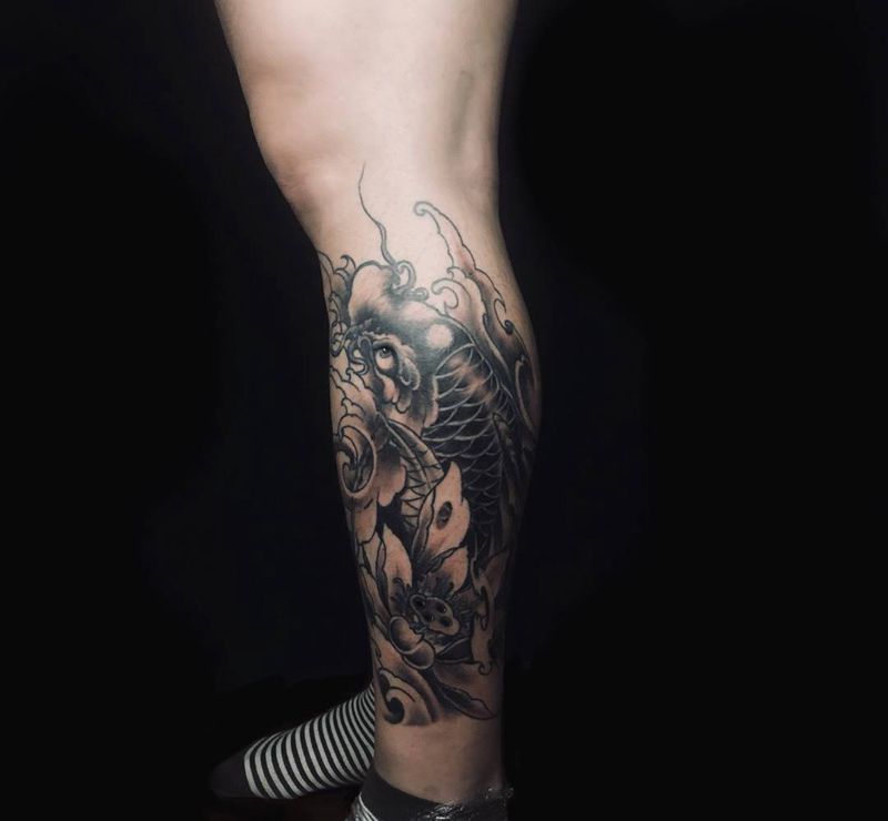 • T网红王老大花腿龙纹身图片_腿部新传统纹身图案