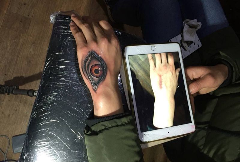 • 手背潮流时尚的玫瑰花眼睛纹身图案