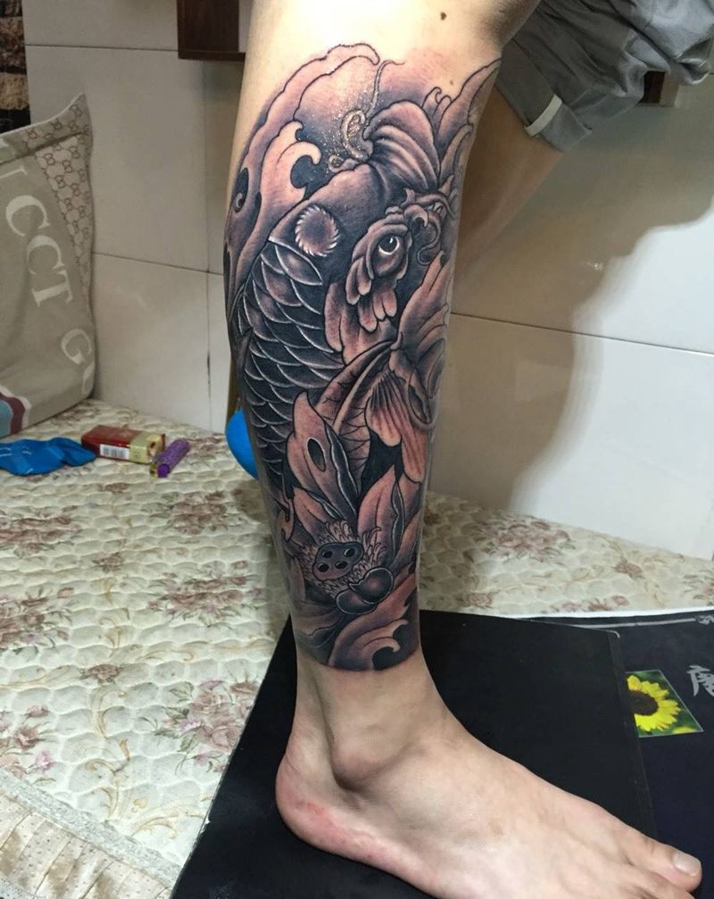 当前位置: 首页 >浙江省绍兴市纹身店-上虞魔鬼堂纹身工作室纹身图案>小腿鲤鱼完成纹身图片