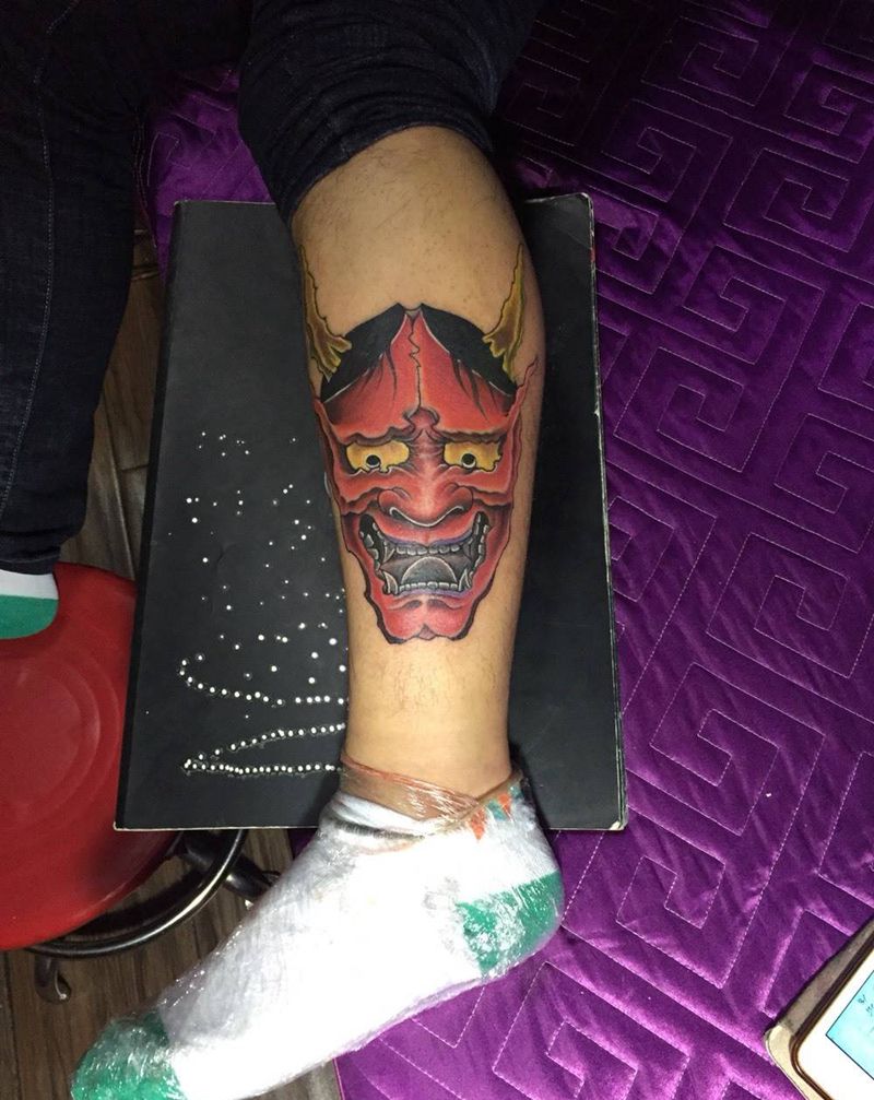 当前位置: 首页 >浙江省绍兴市纹身店-上虞魔鬼堂纹身工作室纹身图案>小腿般若完成纹身图片