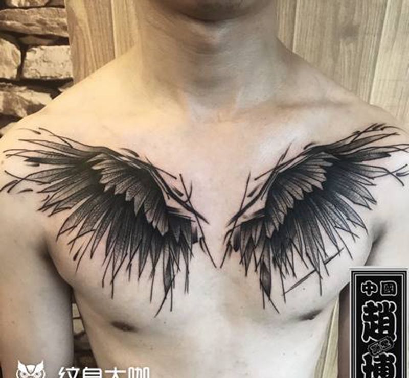 翅膀遮盖纹身纹身图片_胸部新传统欧美写实翅膀纹身图案