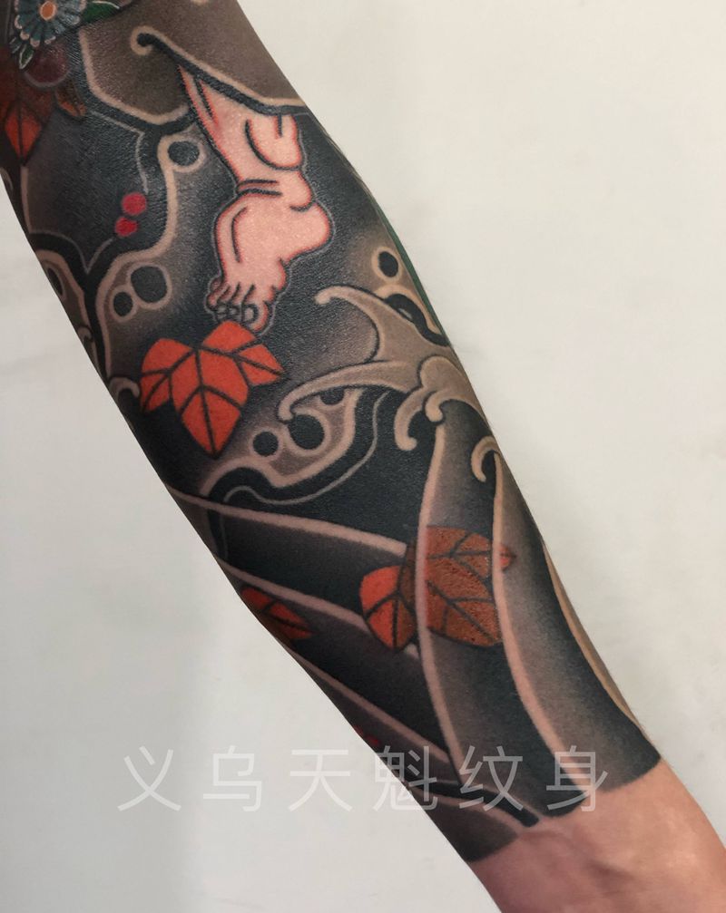 天魁全程圆五针作品:鬼若丸纹身图片_手臂手部老传统纹身图案