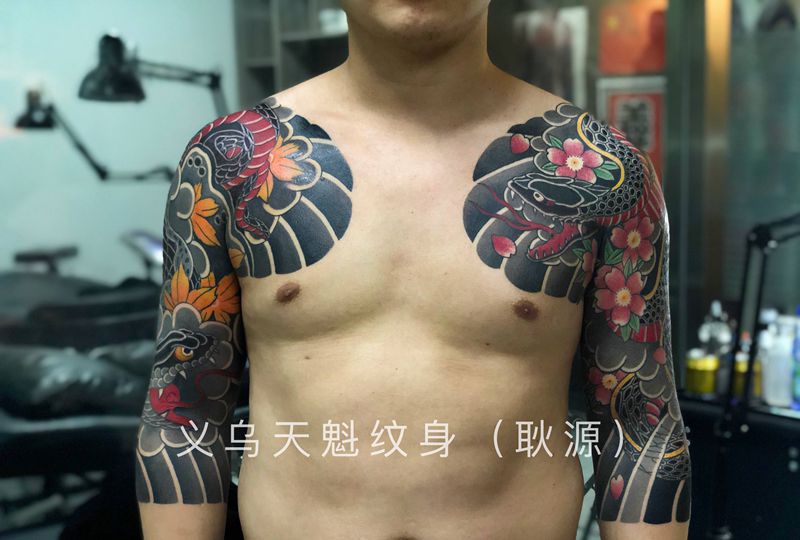 当前位置: 首页 >浙江省金华市纹身店-天魁纹身纹身图案>双半胛七分袖:蛇