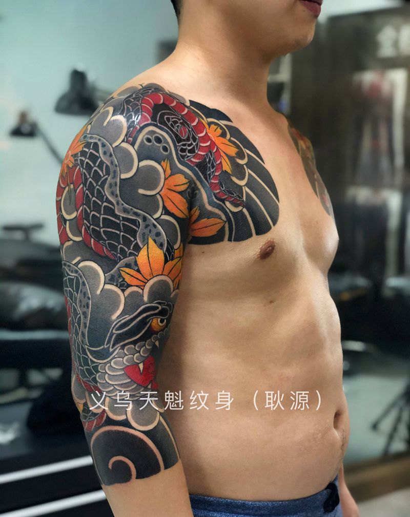 当前位置: 首页 >浙江省金华市纹身店-天魁纹身纹身图案>双半胛七分袖:蛇