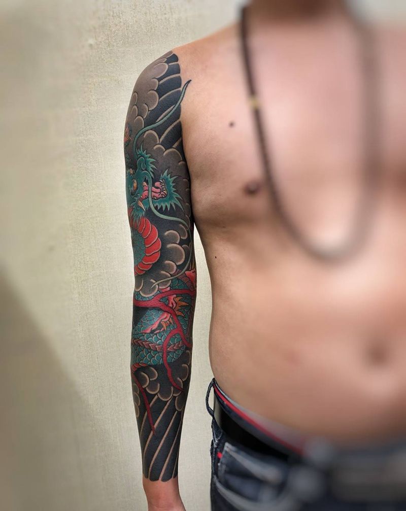 当前位置: 首页 >浙江省金华市纹身店-天魁纹身纹身图案>老传统花臂龙纹身图片