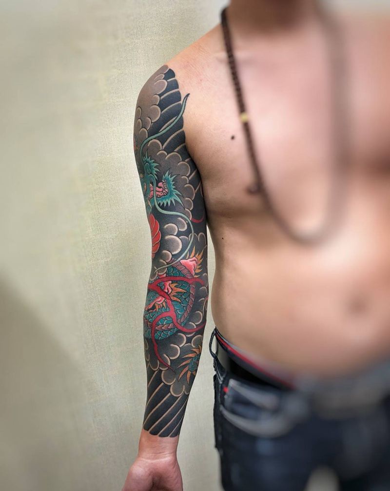 当前位置: 首页 >浙江省金华市纹身店-天魁纹身纹身图案>老传统花臂龙纹身图片