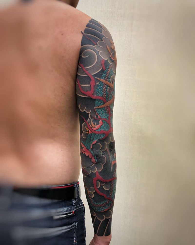 当前位置: 首页 >浙江省金华市纹身店-天魁纹身纹身图案>老传统花臂龙纹身图片