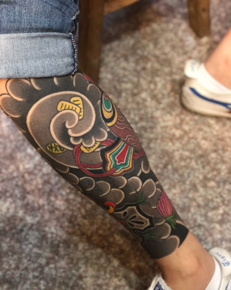• T网红王老大花腿龙纹身图片_腿部新传统纹身图案