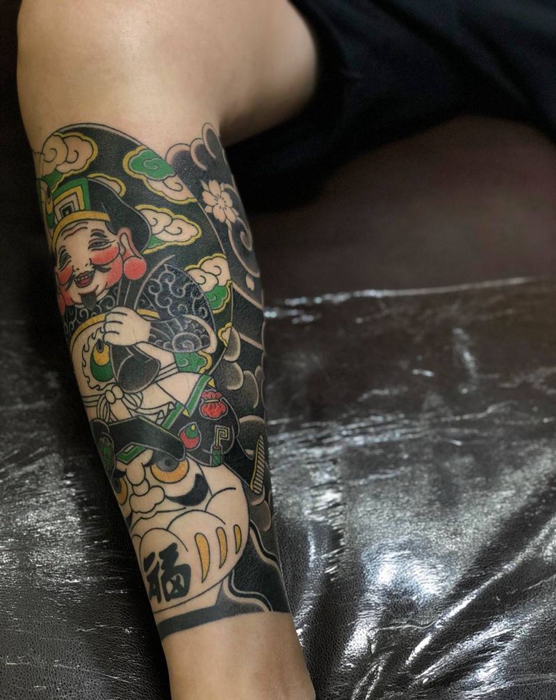 昨日财神彩色部分纹身图片_腿部老传统纹身图案