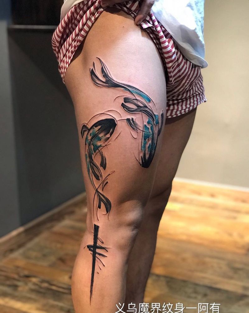 水墨双鱼纹身图片_腿部臀部水墨水彩双鱼座大腿文身水墨鱼纹身图案