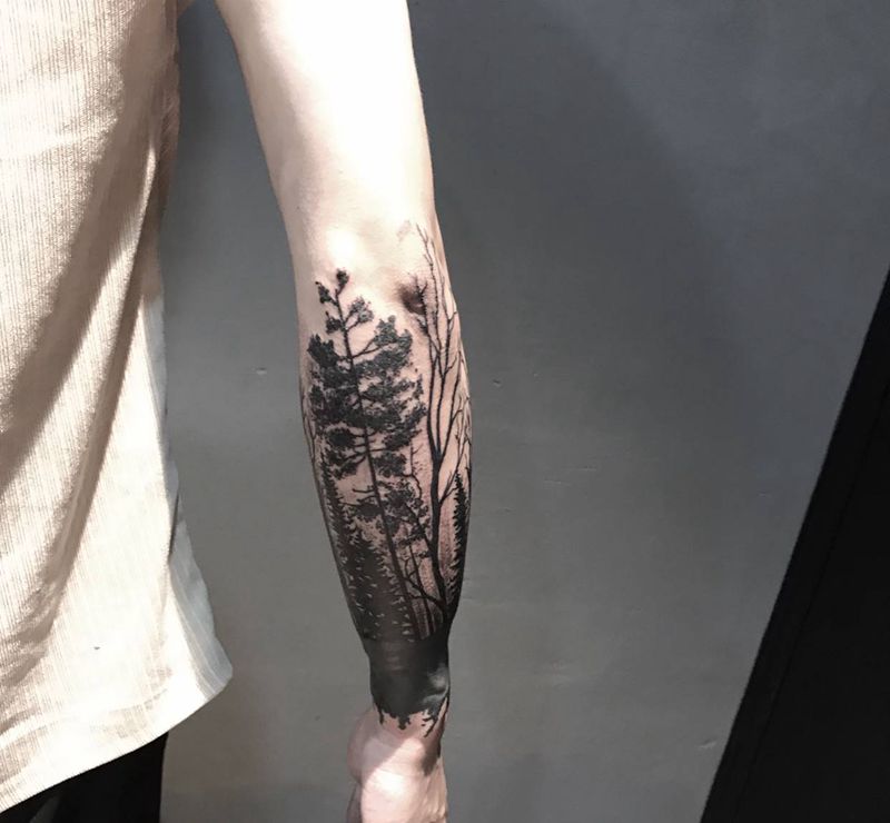 森林墓碑包小臂纹身图片_手臂手部水墨点刺森林墓碑包小臂纹身图案
