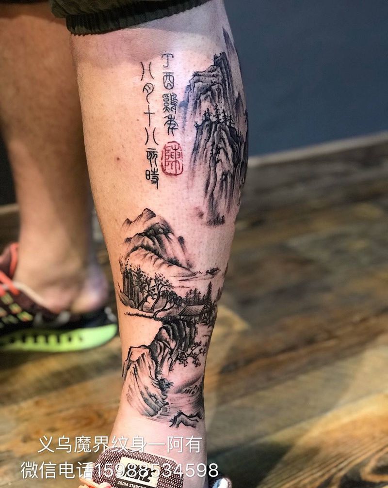 山水画纹身纹身图片_成品国画传统习俗静物原创植物腿部脚部手臂纹身图案