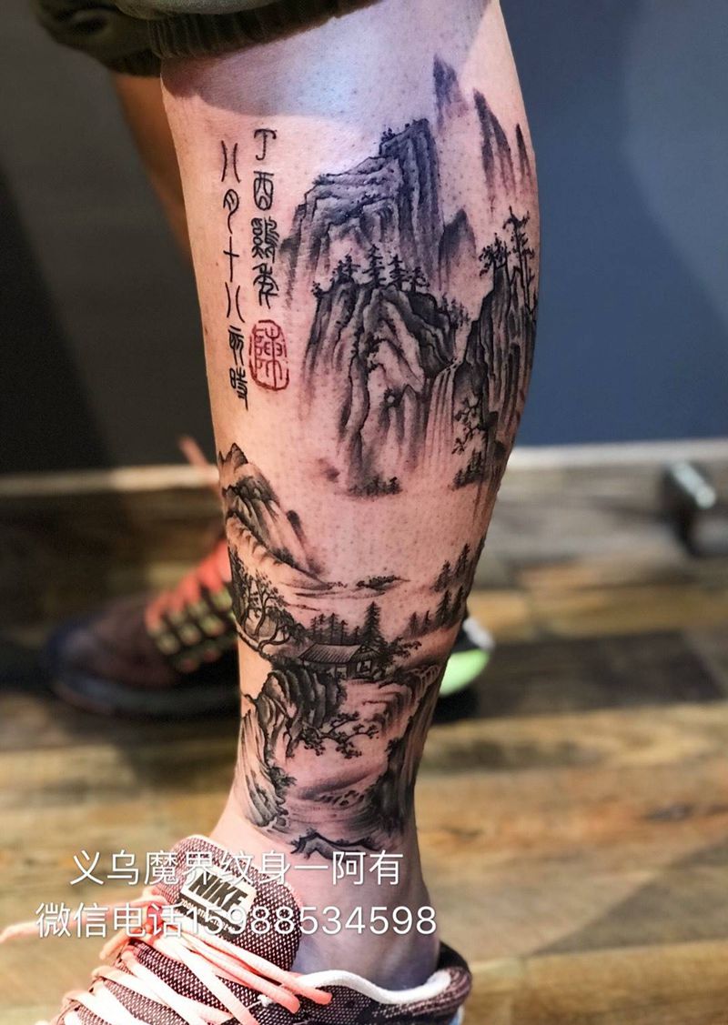 山水画纹身纹身图片_成品国画传统习俗静物原创植物腿部脚部手臂纹身图案