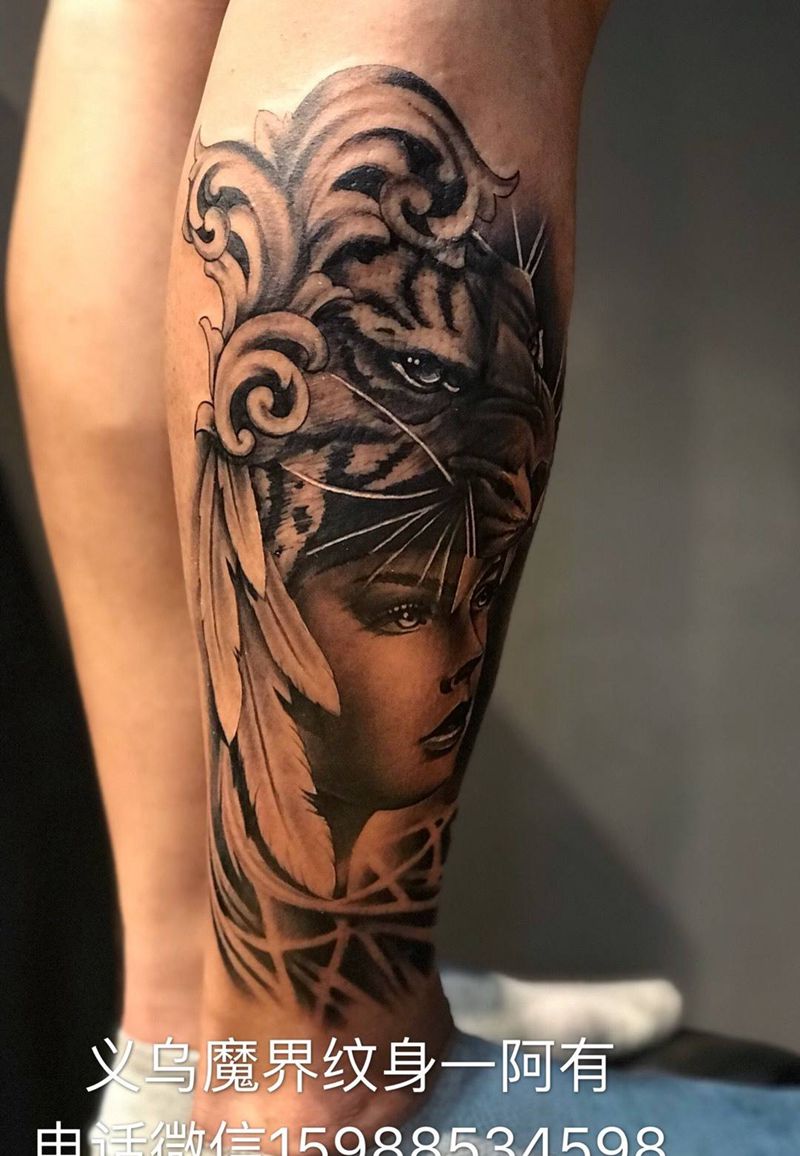 美女虎纹身图片_成品宗教动物人物植物腿部手臂欧美肖像写实纹身图案