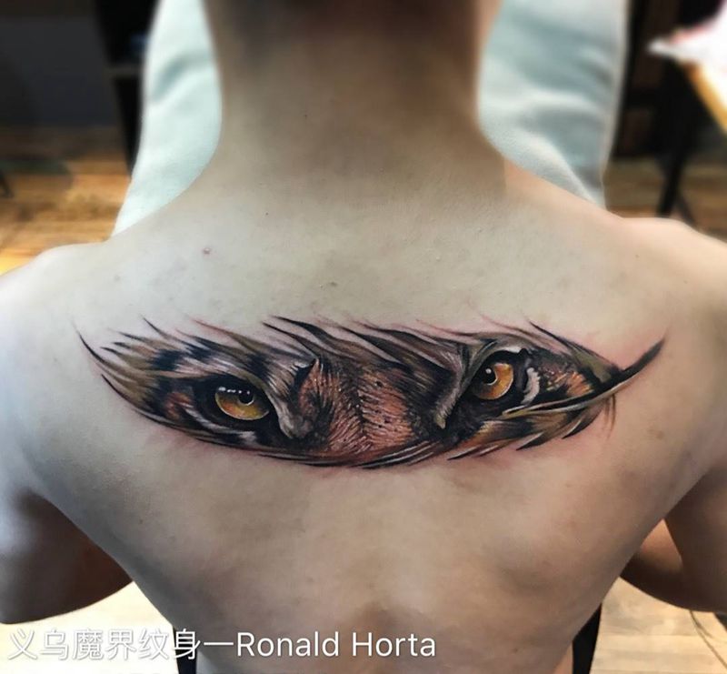 虎眼羽毛纹身图片_欧美清新写实动物背部成品手臂原创几何习俗纹身图案