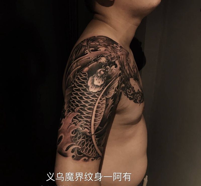 当前位置: 首页 >浙江省金华市纹身店-义乌魔界纹身纹身图案>半胛鱼山水纹身图片_手臂胸部新传统水墨山水风景纹身图案