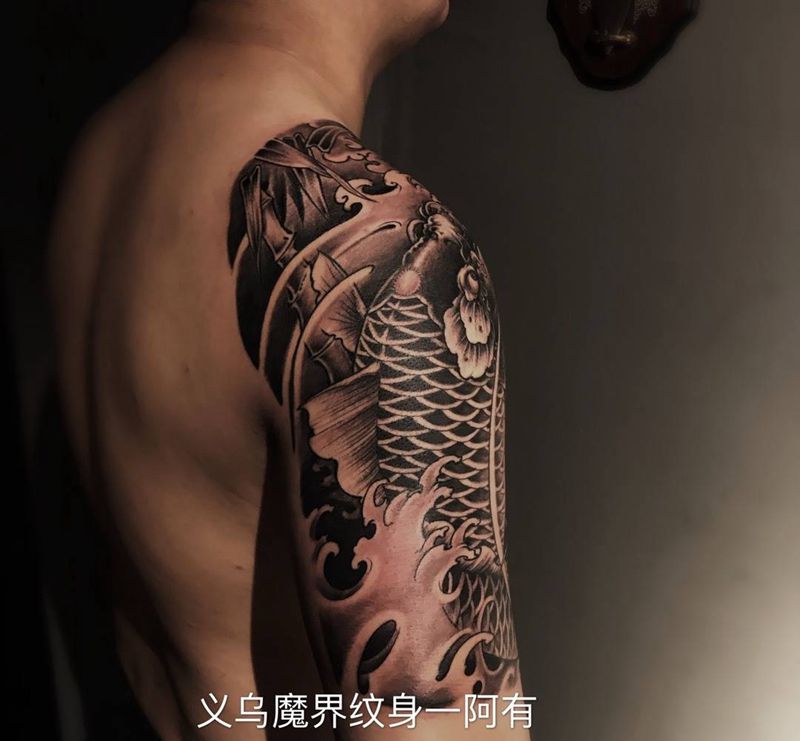 当前位置: 首页 >浙江省金华市纹身店-义乌魔界纹身纹身图案>半胛鱼山水纹身图片_手臂胸部新传统水墨山水风景纹身图案