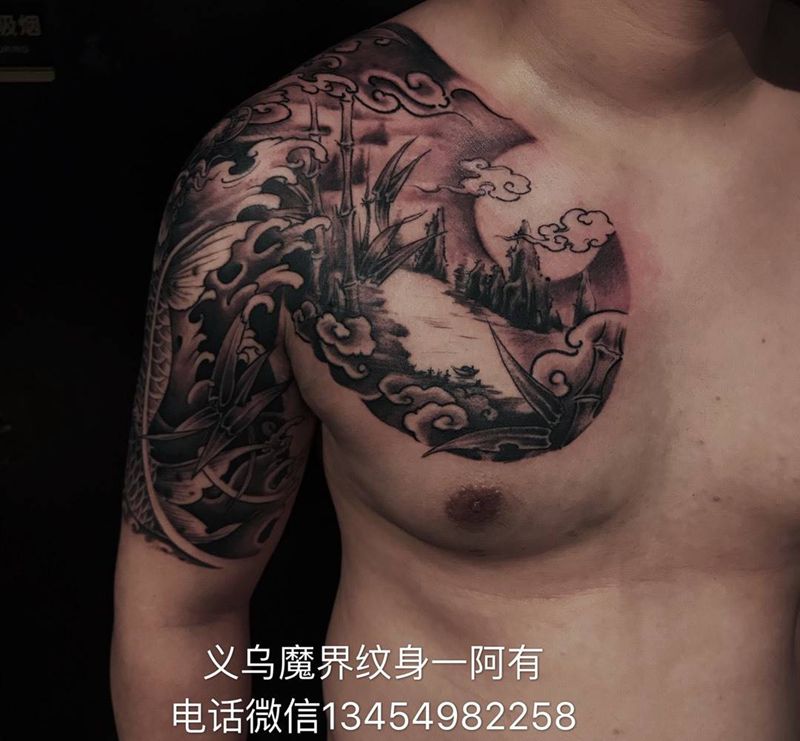 当前位置: 首页 >浙江省金华市纹身店-义乌魔界纹身纹身图案>半胛鱼山水纹身图片_手臂胸部新传统水墨山水风景纹身图案