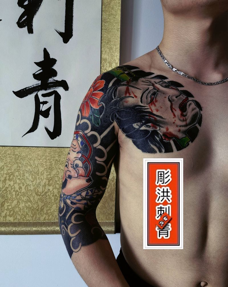 生首火男成品加1纹身图片_手臂胸部老传统纹身图案