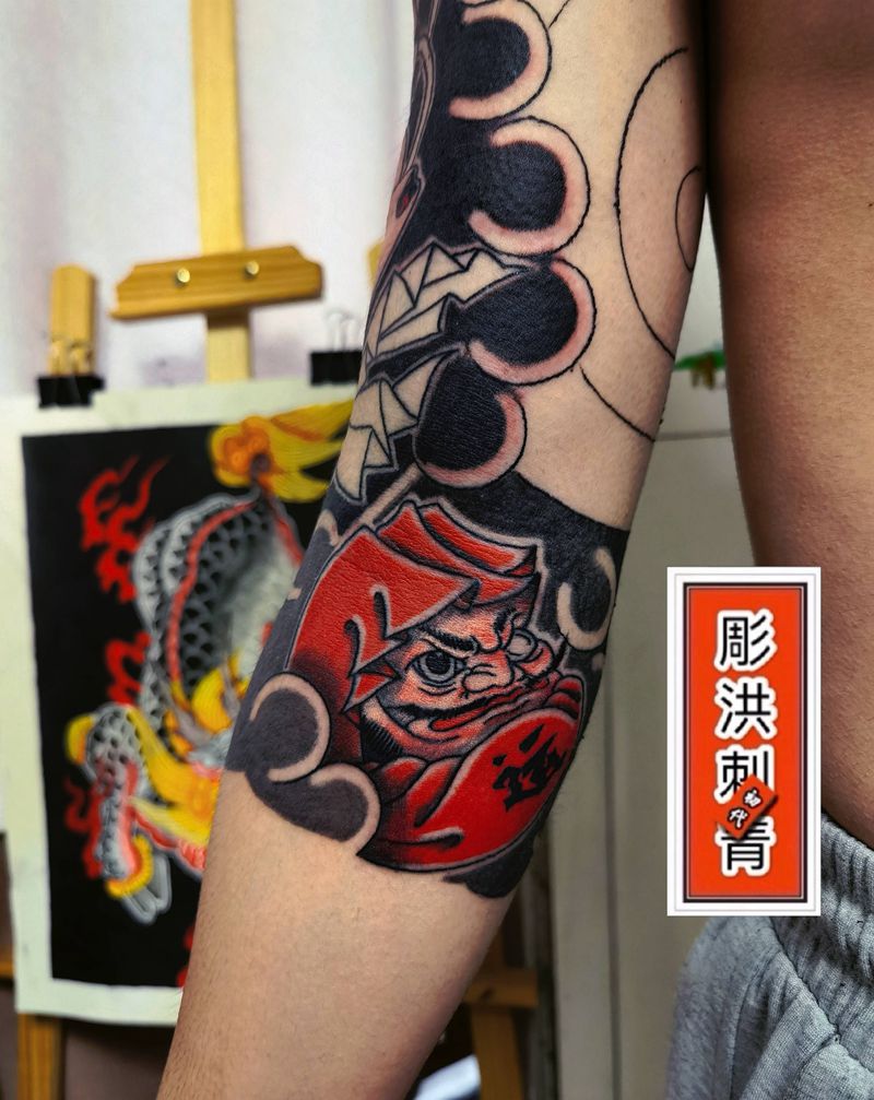 当前位置: 首页 >浙江省金华市纹身店-彫洪刺青纹身图案>火男达摩蛋纹身图片_手臂老传统纹身图案