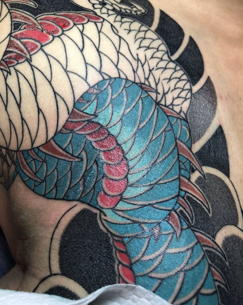 • T网红王老大花腿龙纹身图片_腿部新传统纹身图案