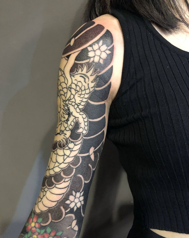 当前位置: 首页 >浙江省金华市纹身店-凡度刺青纹身图案>日式传统花臂拼接纹身图片_手臂老传统龙 福锤花臂纹身图案
