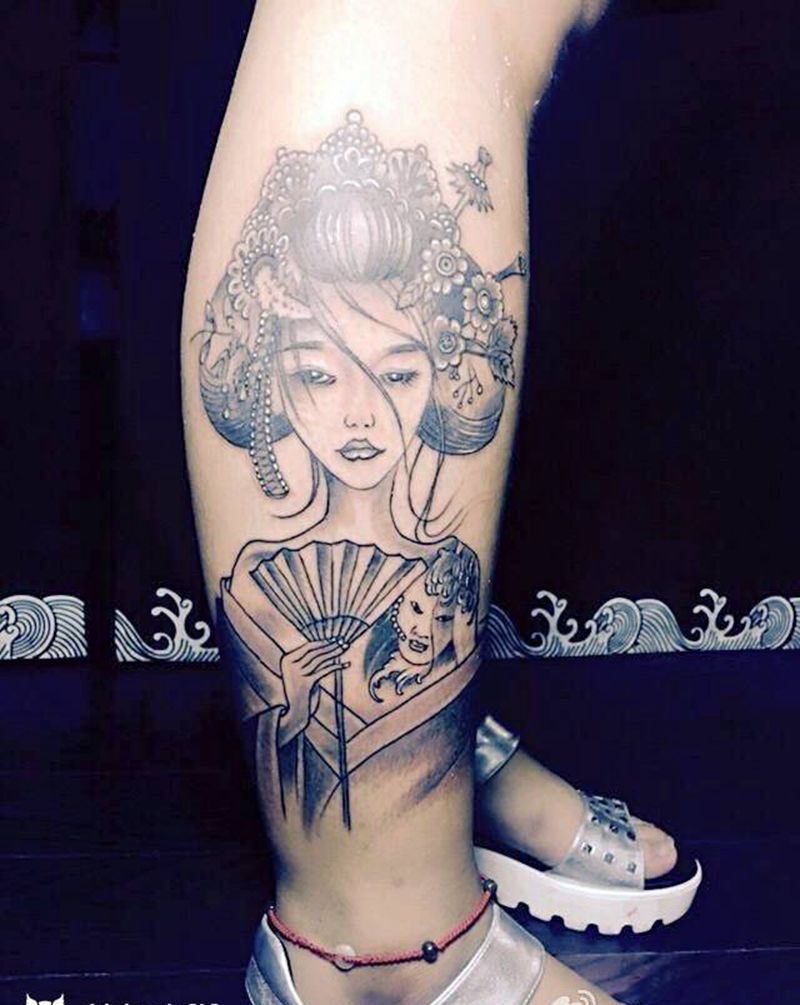 当前位置: 首页 >浙江省金华市纹身店-刺魂纹身纹身图案>小腿艺妓纹身纹身图片